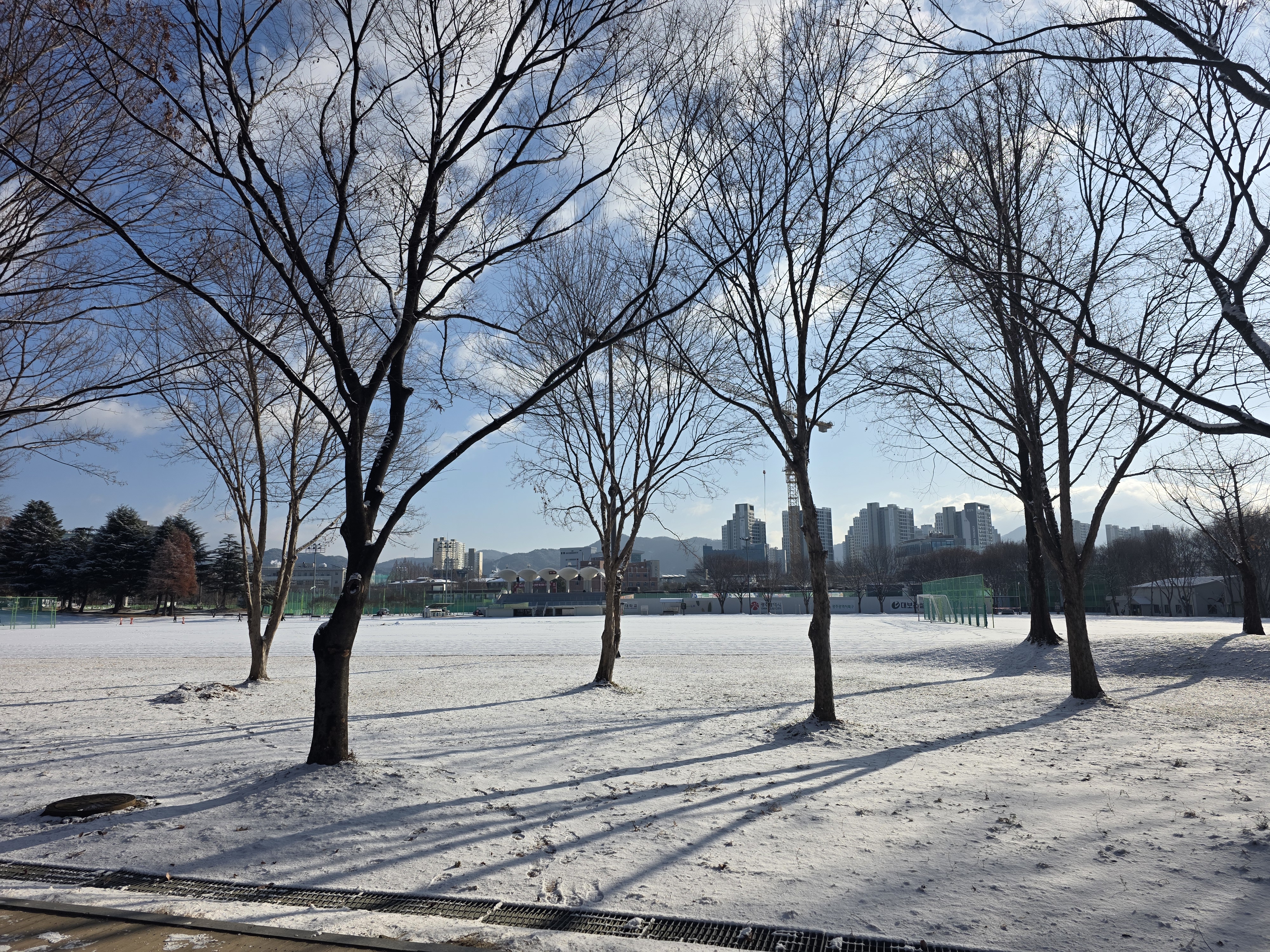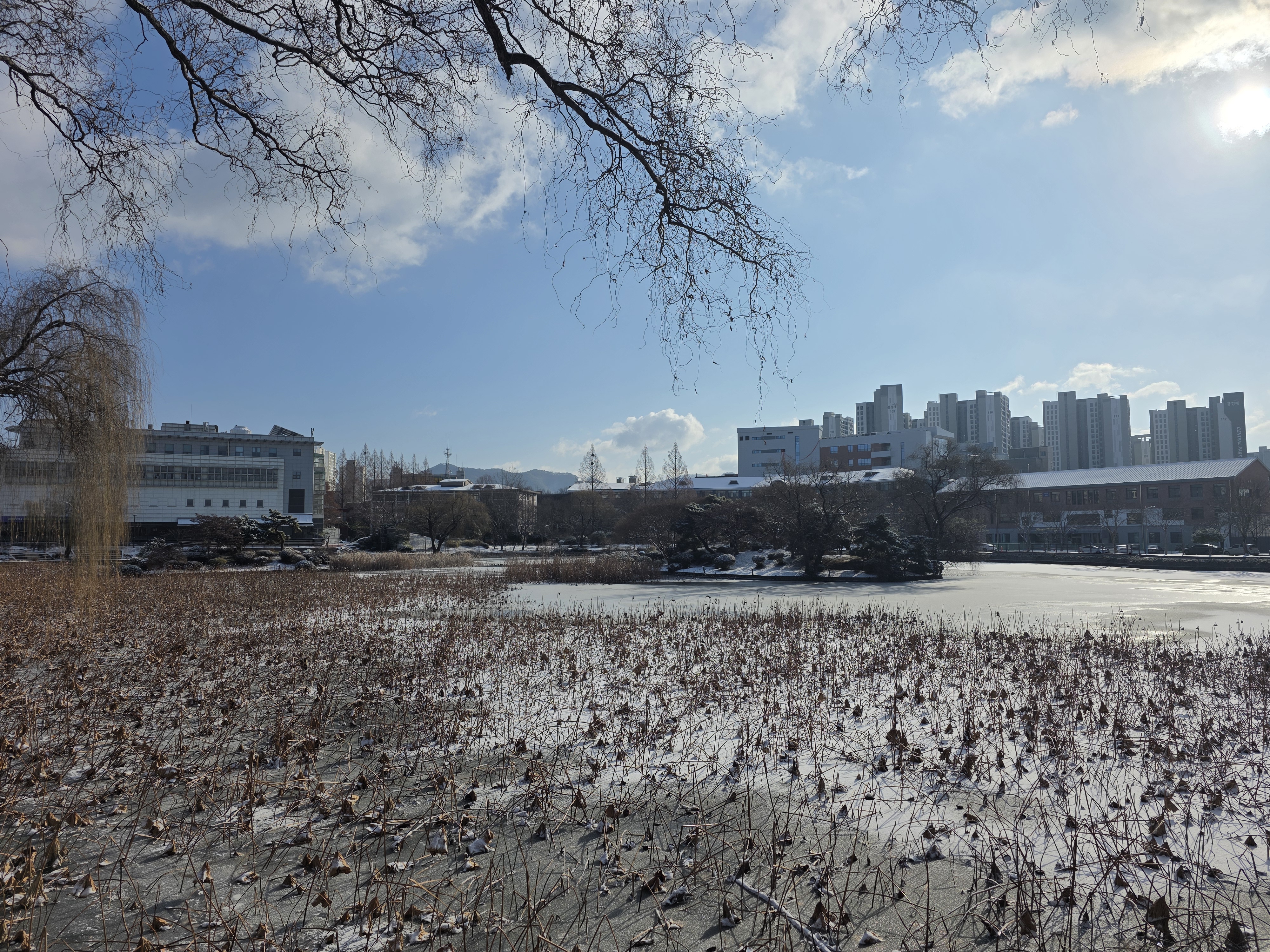 On just the second day of this New Year, I took a walk in the snow. Young and old alike were commuting or engaging in their daily workout. I walked about at Chonnam National University. The snow covered everything as far as the eyes could see. The partially frozen pond was a sight to behold.